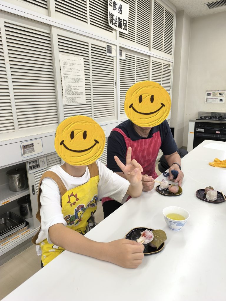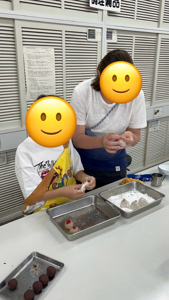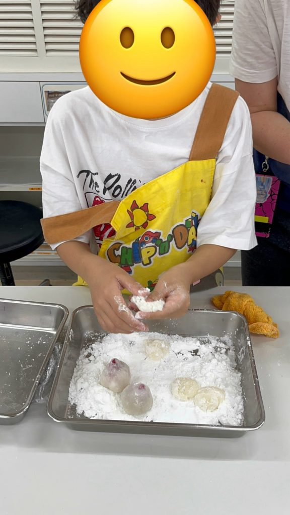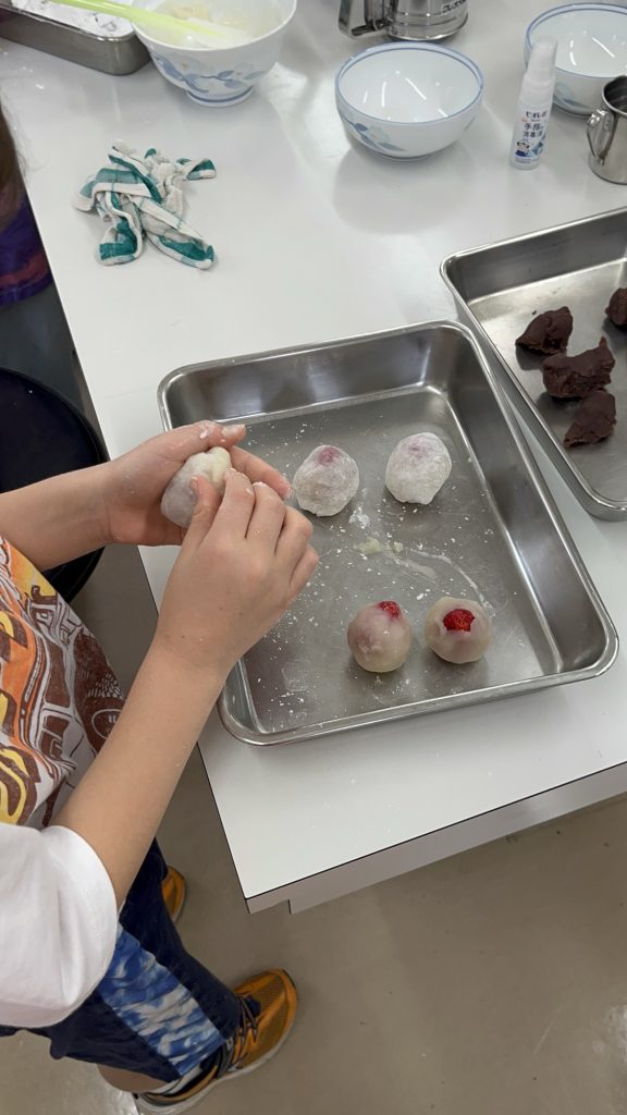 We used the microwave method to heat the dough for these. While it was heating, we prepared the anko (sweet red bean paste) into small balls. Once the dough was ready, everyone focused intently on dividing it and wrapping the anko balls. Once wrapped, the Ichigo Daifuku were complete!
