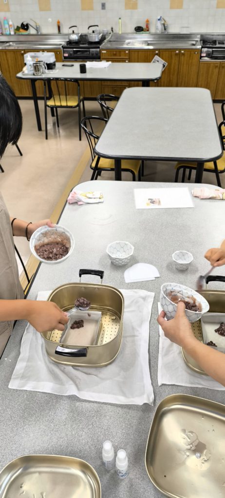 Although we had extra time, the task of removing the paper molds from the Minazuki unexpectedly required some additional time and effort again. So, as in the previous workshop, we packed the sweets as they were for participants to take home and finish cutting and serving themselves.