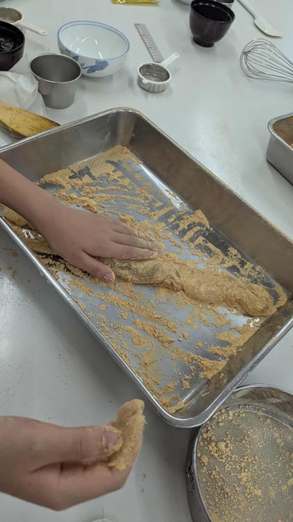 After coating the finished mochi with kinako (roasted soybean flour) and cutting it into bite-sized pieces, we had a batch of smooth, shiny warabi mochi ready to enjoy.
